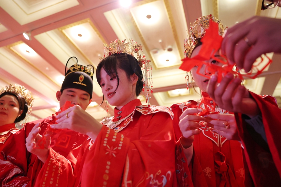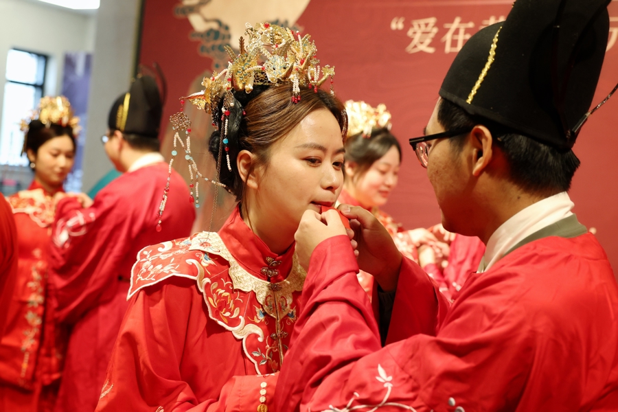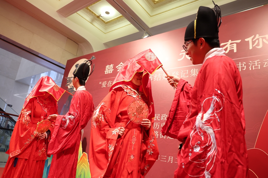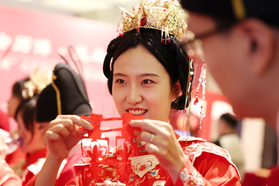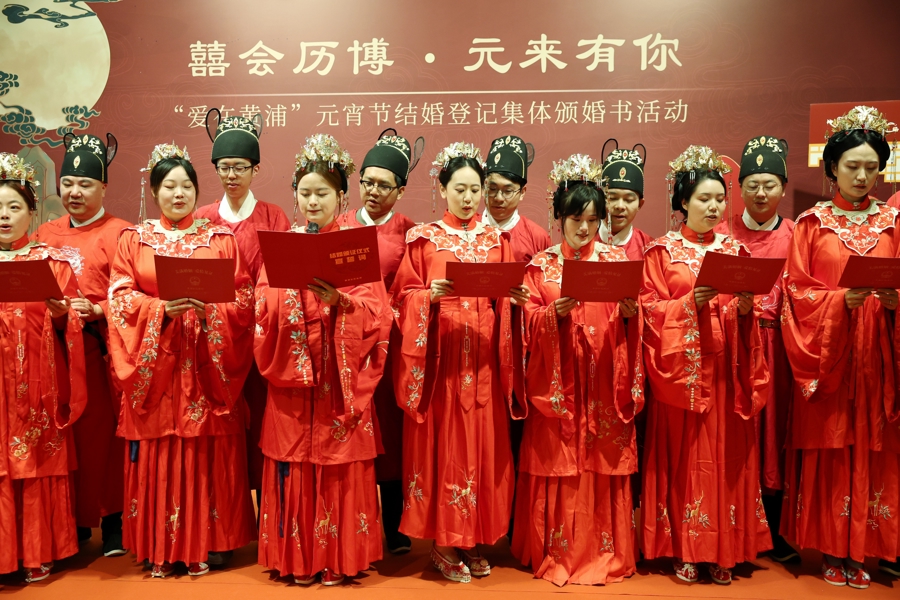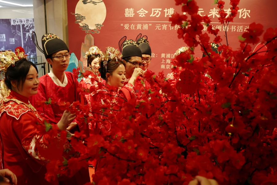 新东谈主们身着华服,手挂花灯,猜文虎、道贺愿,细心许下捏手一世的诺言。