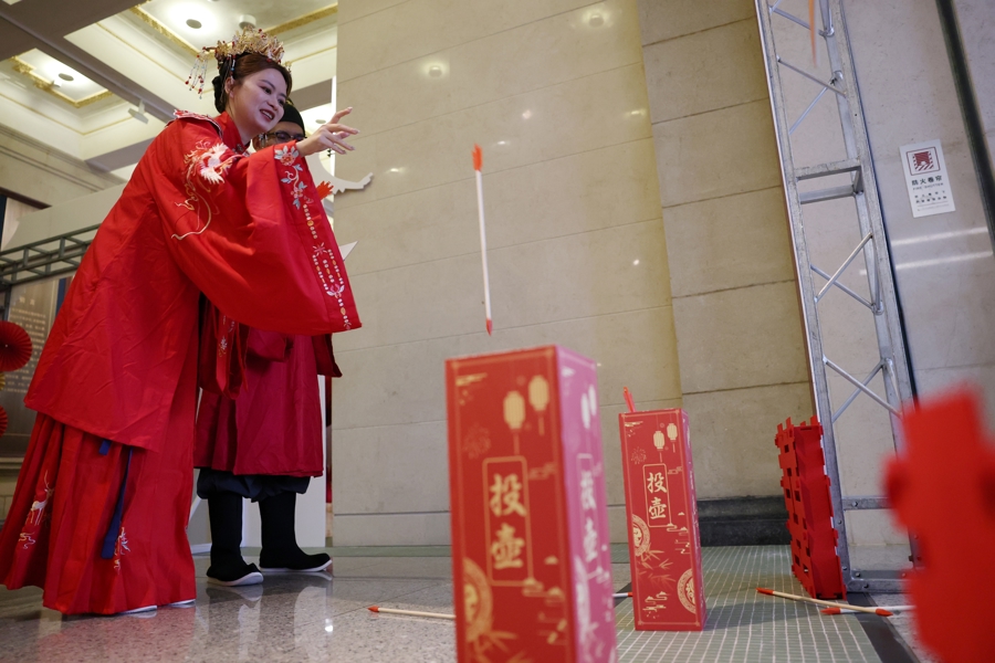 一双新东谈主在参与投壶游戏。