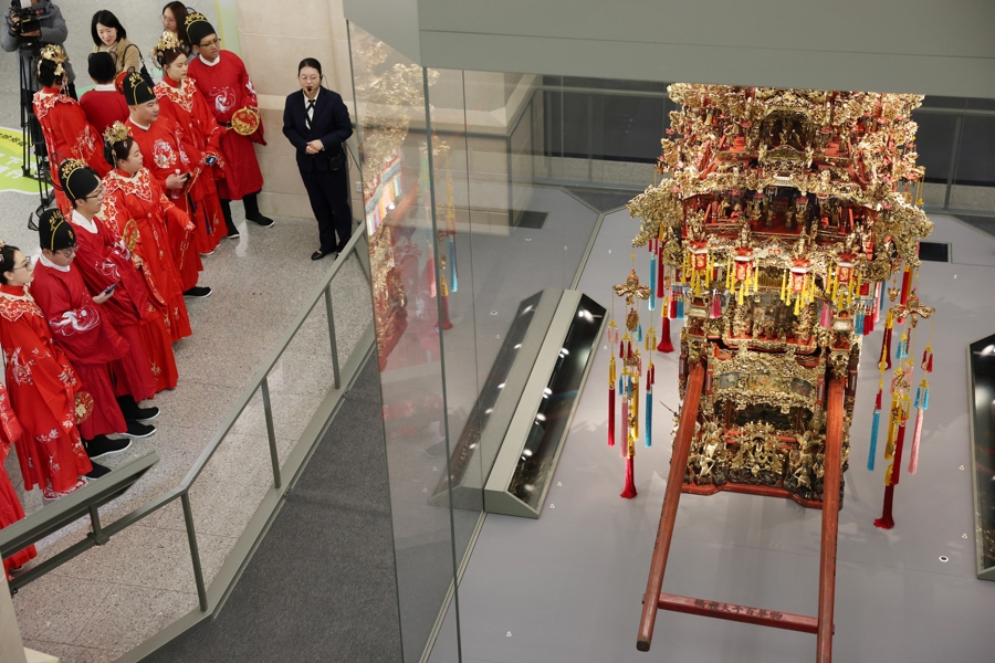 新东谈主们在参不雅上海市历史博物馆的馆藏重器。高达2.85米、耗时十年雕塑完成的“物华号百子大礼轿”,不仅是传统婚俗文化的进军载体,也为在此立下誓词的新东谈主奉上脱落百年的祝福。