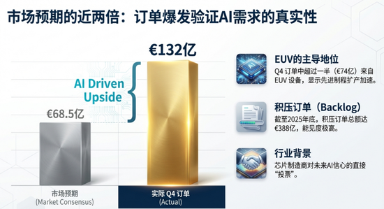 财报显示,第四季度订单额达132亿欧元,几乎是彭博汇编的分析师平均预期68.5亿欧元的两倍,较上季度的54亿欧元大幅增长。这一创纪录表现受益于人工智能基础设施的快速发展,Meta Platforms Inc.和微软等科技巨头正投入数千亿美元建设数据中心。值得注意的是,在第四季度订单中,EUV订单金额达到74亿欧元,此外订单积压规模达388亿欧元。